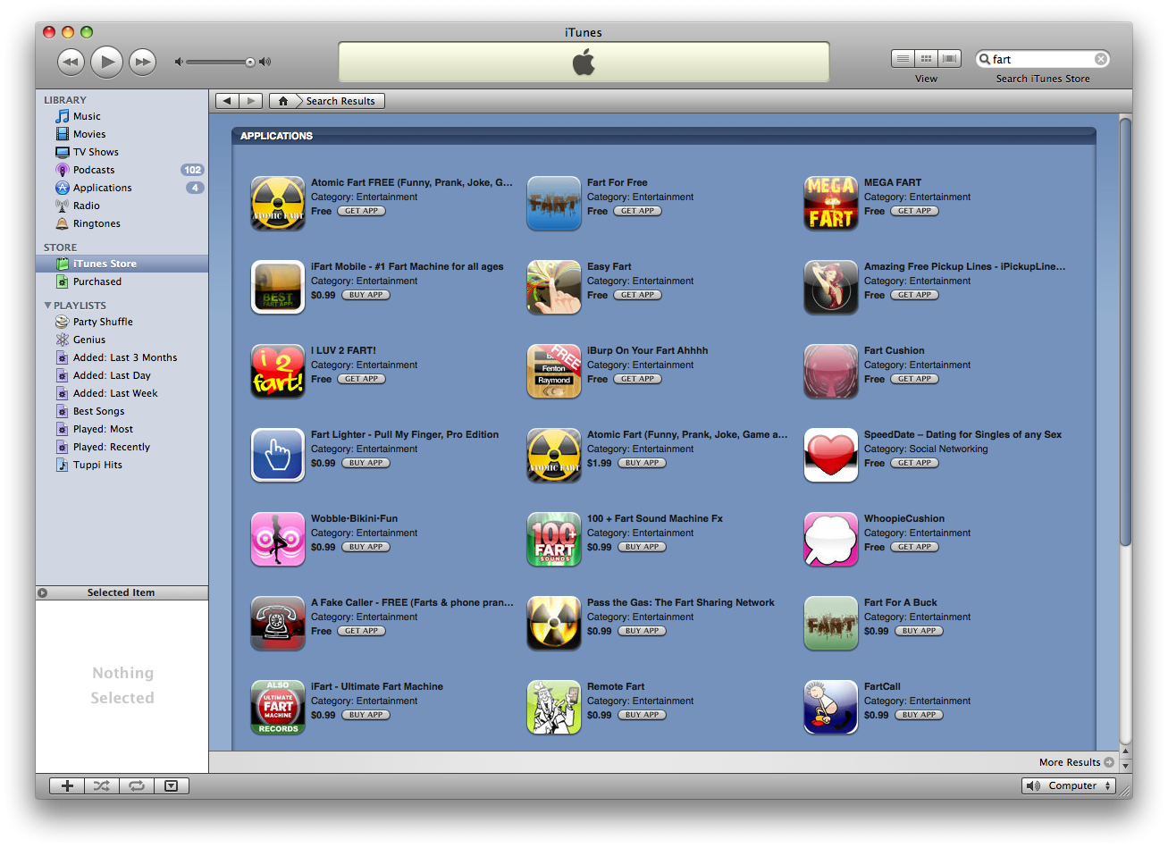 Essa é muito boa: desde que a Apple relaxou com softwares de “entretenimento duvidoso” — incluindo apps de peidos, arrotos e afins —, a App Store foi dominada por títulos dos mais variados — alguns pagos e muitos gratuitos —, que parecem fazer a diversão da criançada (e dos adultos com espírito de criança, é claro) no mundo todo. Eu, pessoalmente, nunca comprei um deles e nem sequer baixei um gratuito — acho uma total perda de tempo (e de espaço no meu iPhone).