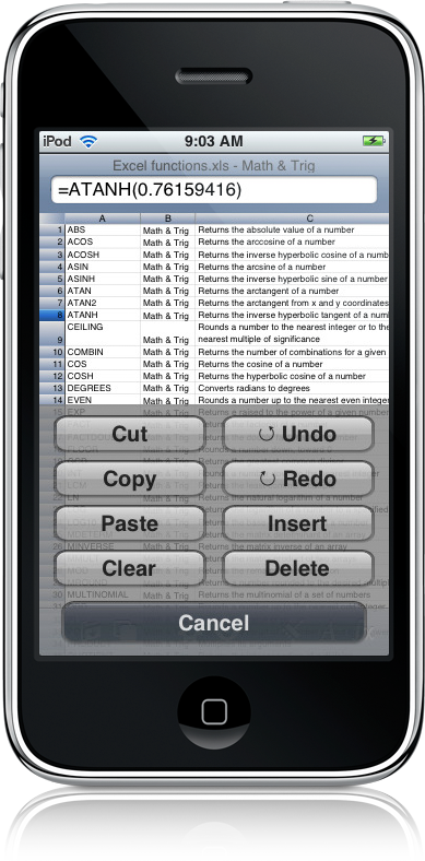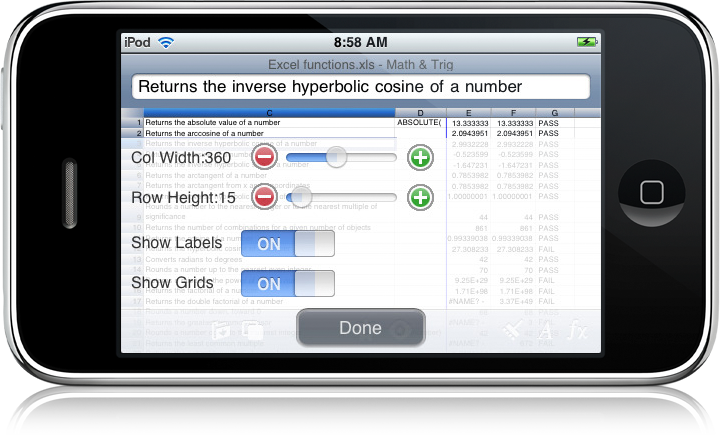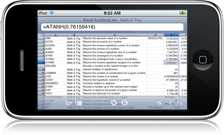 O aplicativo traz 24 funções matemáticas, 18 financeiras, 17 trigonométricas, 13 estatísticas, 14 de tabelas lookup, além de funções de data, texto e informações — e ainda mais vêm aí. Ele suporta congelamento e divisão de painéis, além da adição de bordas, troca de fontes, cores e alinhamento, podendo ser usado tanto na vertical quanto na horizontal.